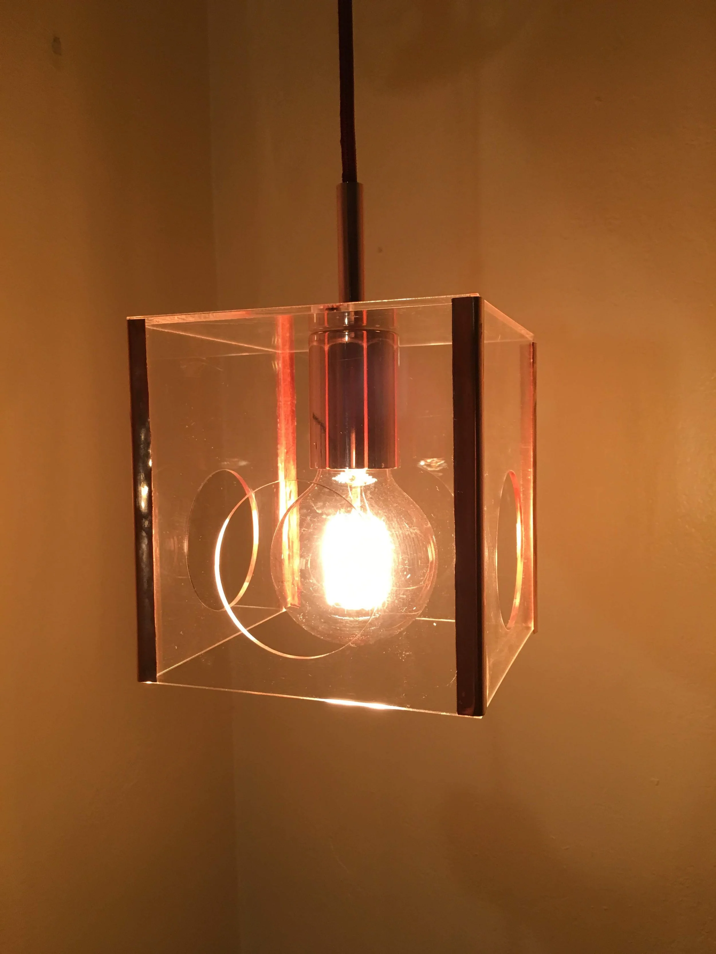 I absolutely love lighting. A nicely designed light fixture makes me so happy, I wanted to try to create that happiness myself. Out of this exploration, a ton of fixture ideas were born. Since I easily have enough lighting design content to create a website, I will just show one here. When I design lighting, I draw on large format paper, instead of using a program. With my predisposition for building things, I naturally moved from drawing to figuring out how to build what I just designed. I taught myself how to wire and built every light fixture I’ve made from scratch. I name my fixtures after the moons of different planets (an ode to my interest in astronomy); this one is named Skoll (a moon of Saturn). Skoll is made of acrylic and real copper.